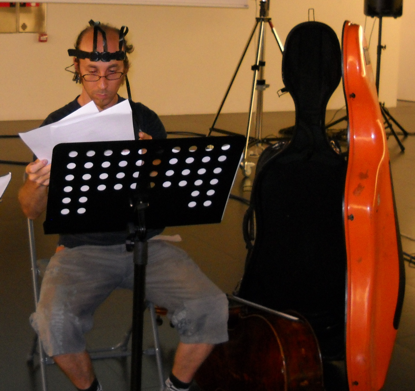 The Cellist’s and Violinist’s EEG pulse and brain signals figure against the Baroque Basso Continuo that they are playing. They each wear a state of the art wireless Enobio EEG system made by Starlab that transmits EEG, ECG and EOG from brain activity, pulse, and eye movements to 2 laptop computers.