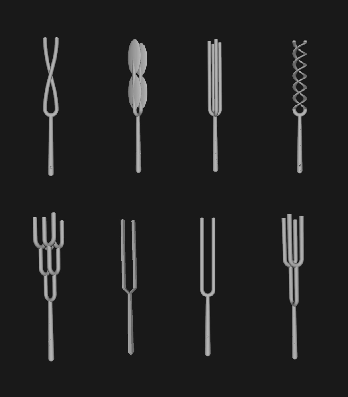 The tuning fork rules the orchestra through its precisely repeatable production of a tone at a specific frequency. The shape is designed to produce a simple tone, and slow-motion video shows how the two-pronged arrangement amplifies the primary mode of vibration while damping other more complex twisting and flexing modes. The variations on the tuning fork in this exhibition reconfigure the arrangement of the prongs to allow unruly vibrations. Could an unruly tuning fork sound interesting enough to join the orchestra too?