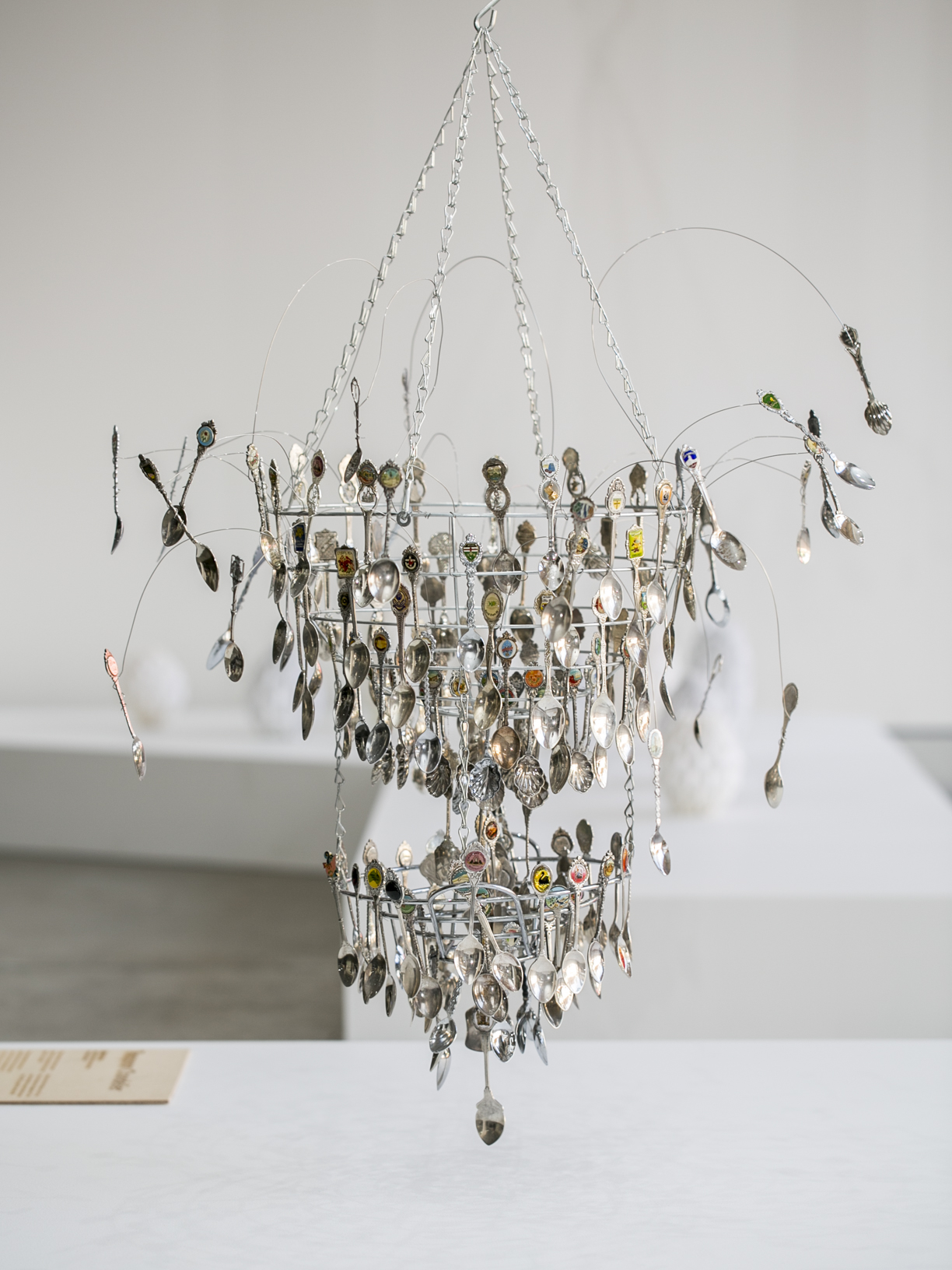 The Teaspoon Chandelier is a collection of souvenir teaspoons from a deceased estate that have been wired together to create a chandelier. This arrangement transforms the collection into a decorative object where the array of shapes and colours sparks curiosity to explore the relationships between them. On closer scrutiny we see that the teaspoons are mainly from country towns in NSW such as Mildura, Cowra, Katoomba and Harden. There are also some from holiday spots such as Port Macquarie, Byron Bay and Surfers Paradise. One series traces a trip from Brisbane up to Cairns, and there is a small sub-set from New Zealand and Fiji. There are also commemorative teaspoons from the Olympics in Moscow, 1980, Los Angeles 1984, and Seoul 1988.