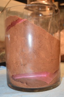 Emma installed the 3D printed burrow in the vase with red desert soil ready to trial with “tank” the desert scorpion.